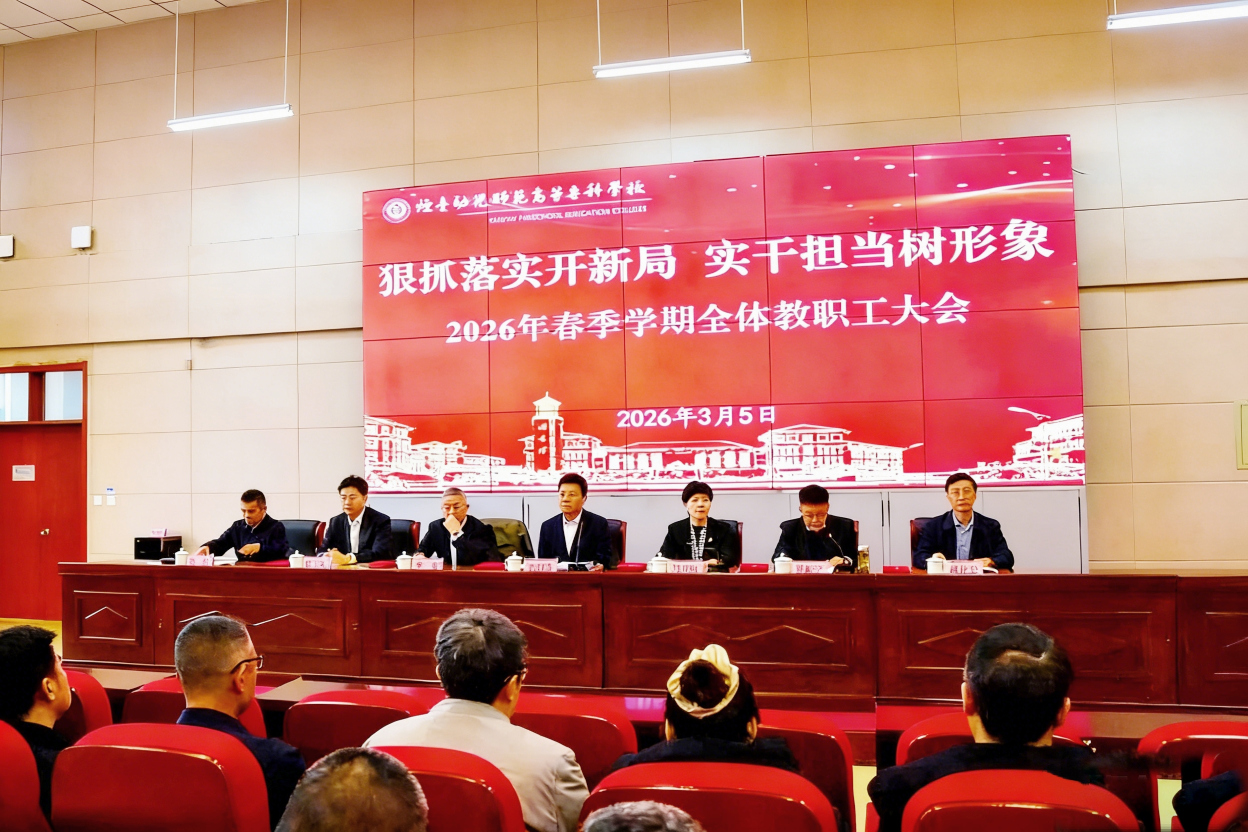 3月5日上午,烟台幼儿师范高等专科学校2026年春季学期全体教职工大会在学术报告厅召开。学校党委书记宫海涛,党委副书记、校长冯开梅出席会议并讲话,在校领导班子成员及全体教职工参加会议。会议由党委委员、副校长崔振宁主持。